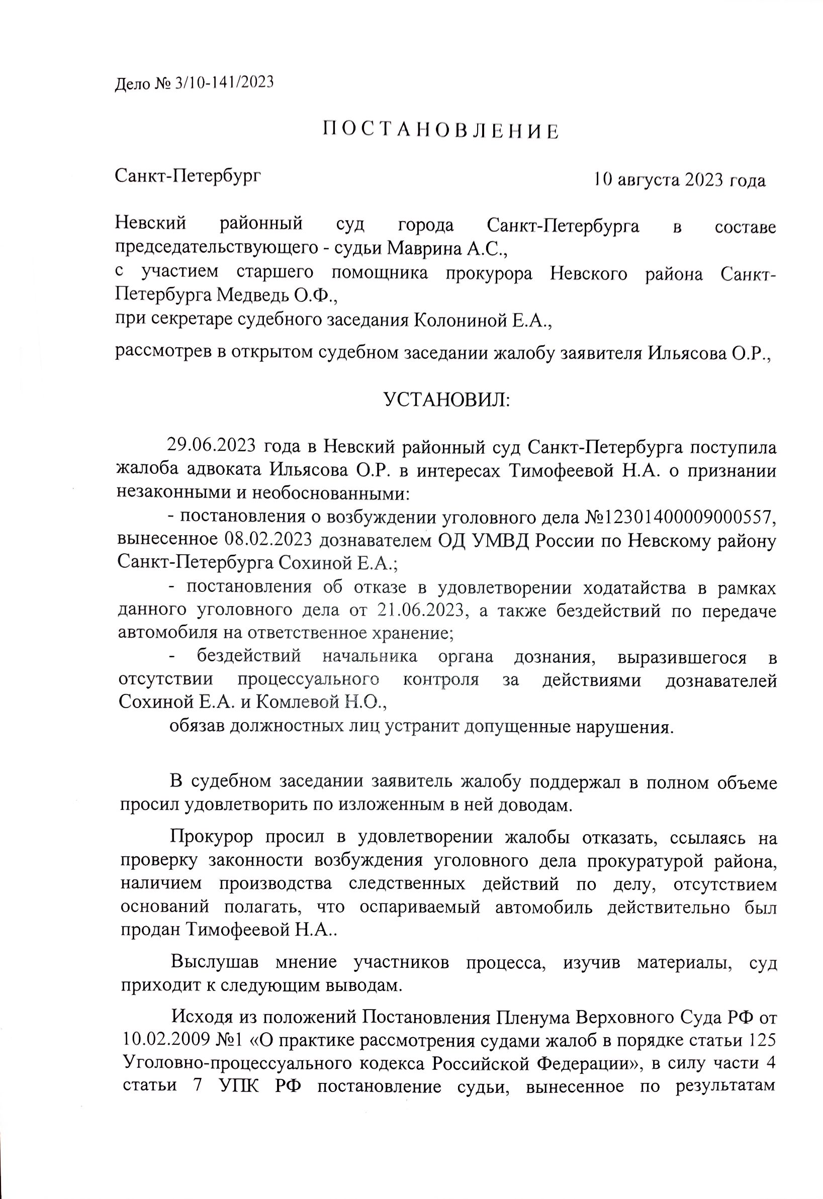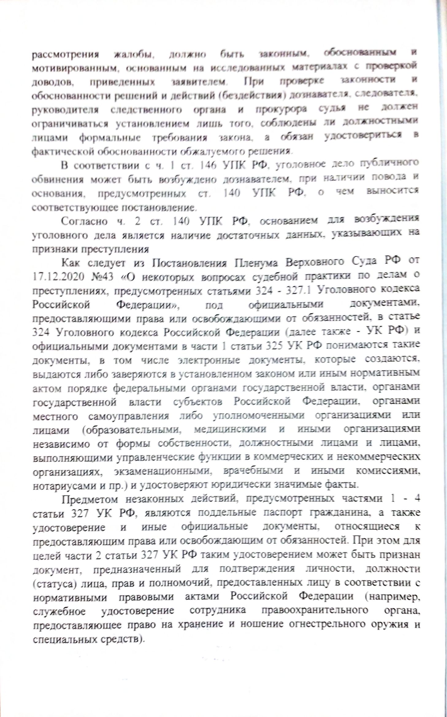 Суд рассмотрел Жалобу и своим постановлением от 10.08.2023 годк улетворил ее частично, признав необоснованным постановление о возбуждении уголовного дела в связи с отсутствием состава преступления, предусмотренного ч.1 ст. 327 УК РФ . Суд посчитал, что признание постановления о возбуждении уголовного дела необоснованным влечет нрезаконность сбор по такому уголовному делу додказательств и производство предварительного расследования. Следовательно, по мнению суда, остальные доводы заявителя судебной оценке не подлежат. Это прямо указано в последнем абзаце мотивировочной части постановления суда.