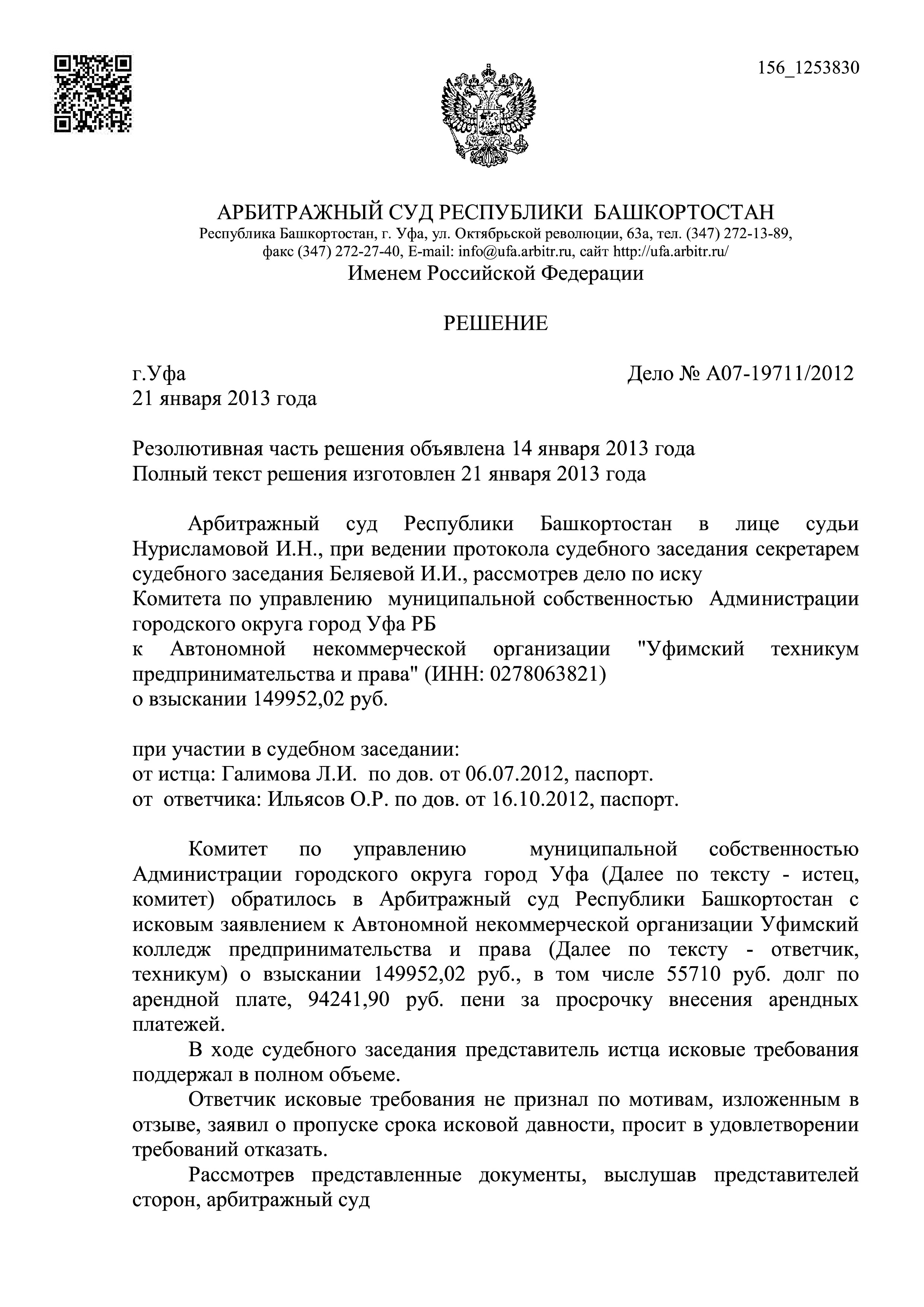 Ранее техникум арендовал помещения еще не у ДОСАФ, а классы 2-3 уфимских школ. За аренду классов директор Техникума расплачивался непосредственно директорам школ излишками техникумской мебели: столами, стульями, партами, … . После переезда в здание ДОСАФ про неудобную «школьную жизнь» директор, сотрудники и преподаватели забыли и стали наслаждаться новым удобным досэафовским помещением. Однако после проверки хозяйственной деятельности школ Комитету по управлению муниципальной собственностью Уфы такой бартер не понравился и он начал забрасывать Техникум исками в Арбитражный суд РБ. Все было три таких иска. Первый суд в 2008 году, еще до моего появления, Техникум проиграл, было взыскано более полумиллиона за аренду, а по двум другим искам с учетом все более ухудшающейся финансовой ситуации Техникума, я его просто спас. По делу № А07-10930/2010 сумма иска была – 320 206, 96 рублей, по делу № А07-19711/2012 – 149 952, 02 рубля. Для Уфы в те годы, для все более «загибающегося» Техникума проигрыш этих сум был бы равносилен катастрофе.