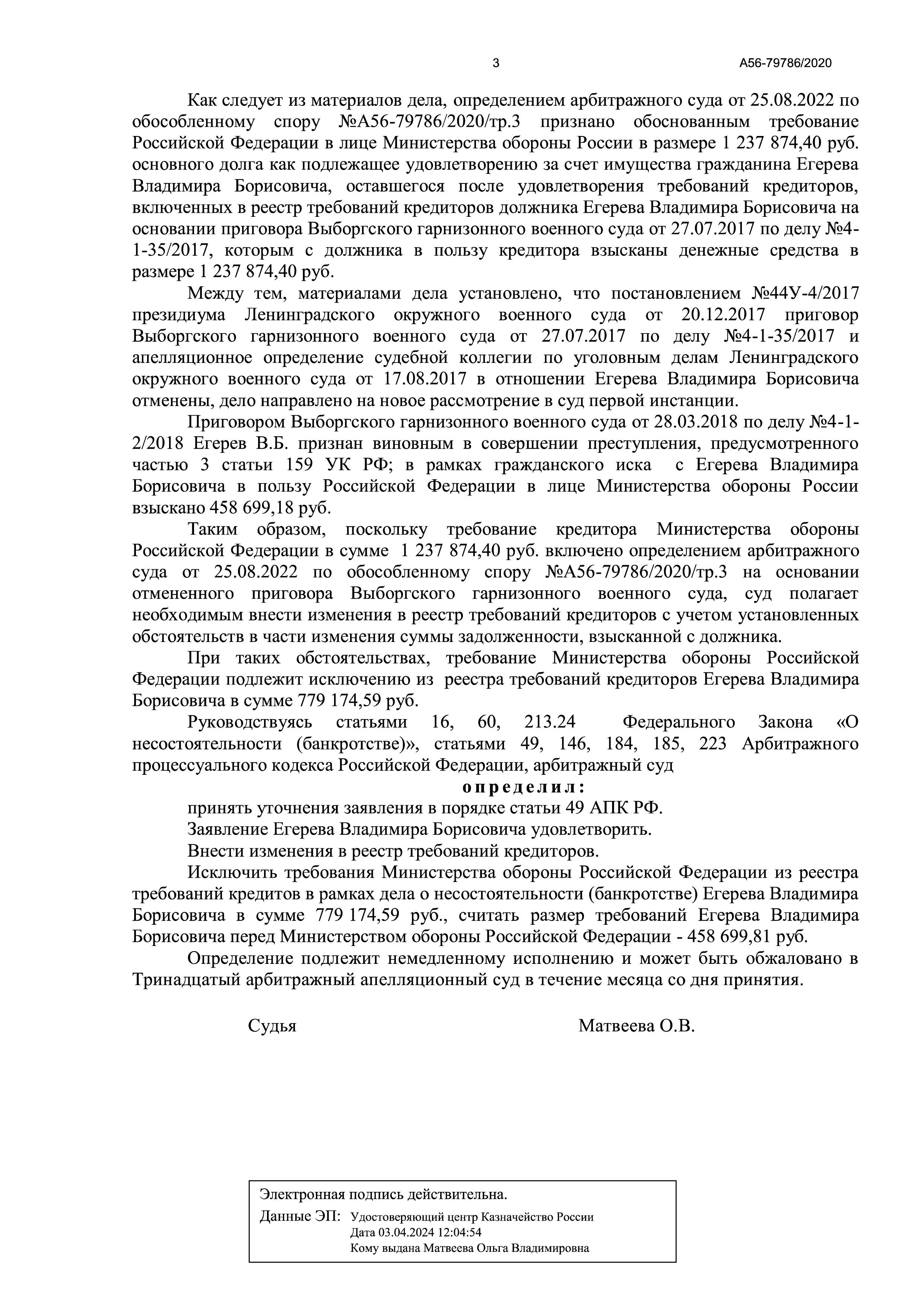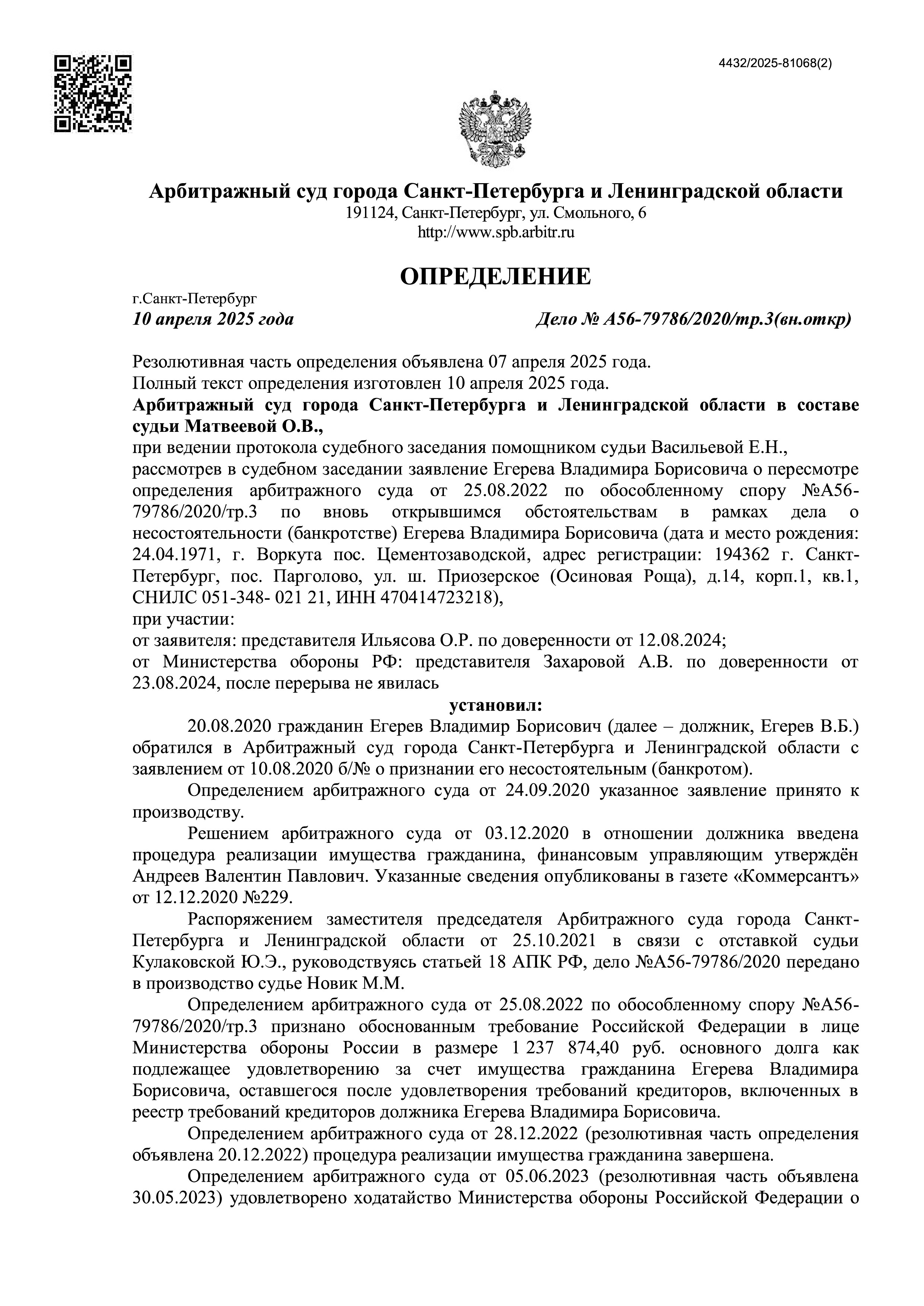 Пришлось мне представлять интересы Егерева в Арбитражном суде Санкт-Петербурга и Ленинградской области, который 07.04.2025 года вынес Определение о внесение изменений в реестр требований кредиторов должника, снизив их в трое, в соответствии с новым приговором. Затем по моему заявлению Арбитражный суд отозвал выданный ранее Министерству обороны исполнительный лист и выдал новый исполнительный лист, в котором подлежащая взысканию сумма уменьшена: в три раза, учитывая новый приговор. Также были учтены суммы, уже взысканные с Егерева по исполнительному производству)