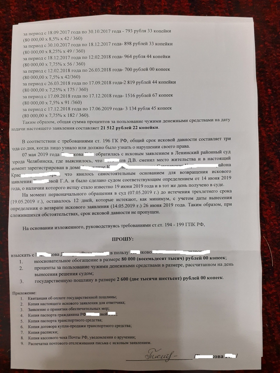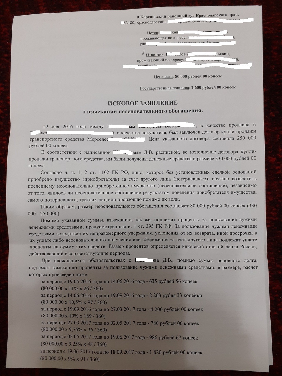 7 мая 2019 года истец подал на меня исковое заяление о неосновательном обогащении на сумму 50 тыс. плюс проценты.