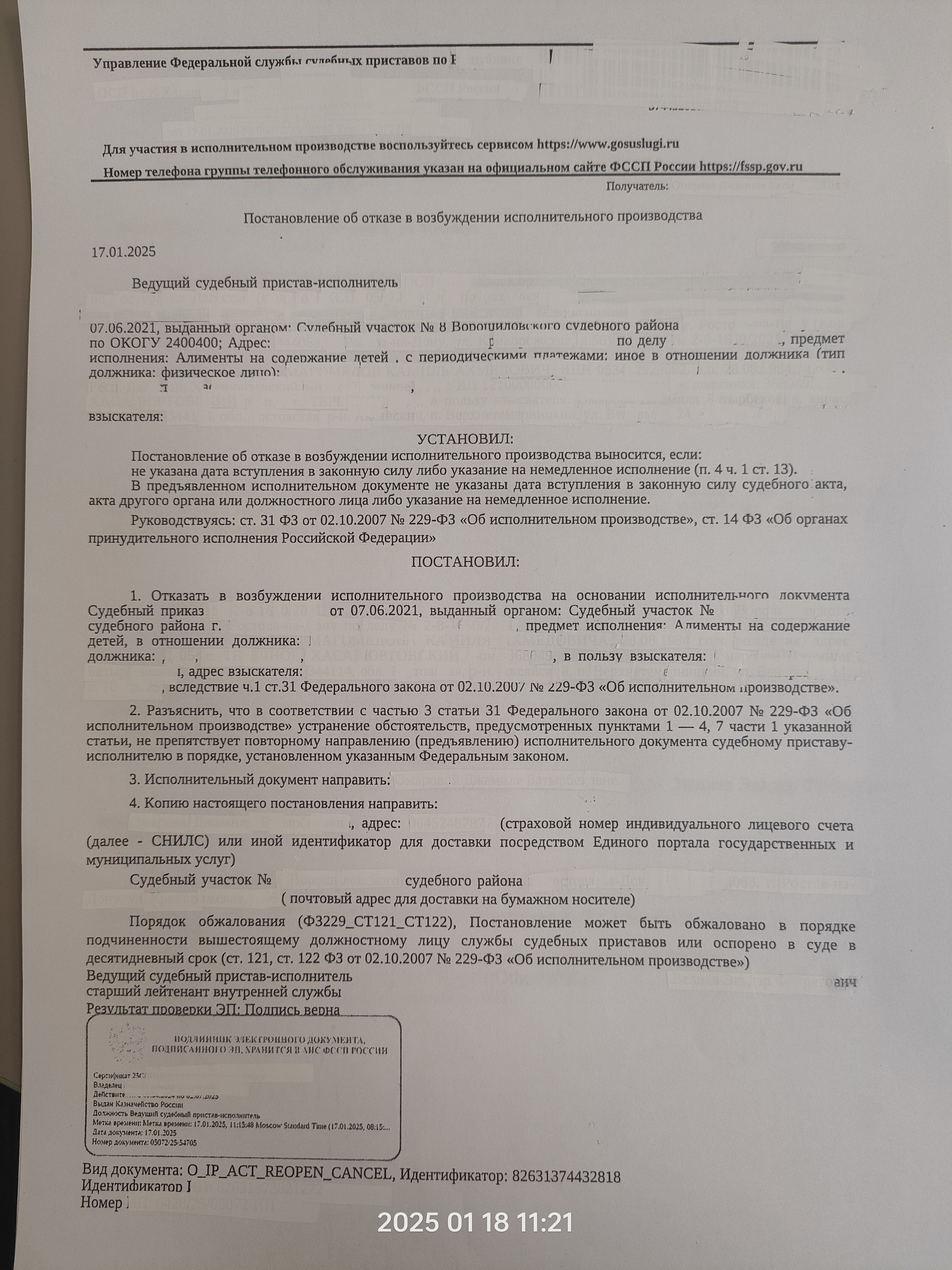 Здравствуйте! Конечно юристы правы, постановление ведущего судебного пристава абсолютно формальное! Но. Есть возможность получить новую копию судебного приказа в судебном участке мирового судьи. С отметкой о вступлении судебного приказа в законную силу. Или подавать новое заявление на выдачу нового судебного приказа с новой датой начала взыскания алиментов. И с новым приказом начинать новое исполнительное производство.
