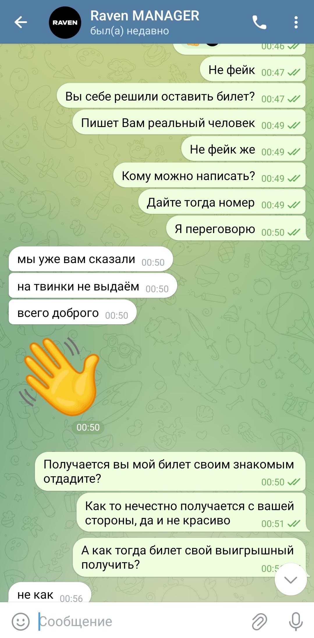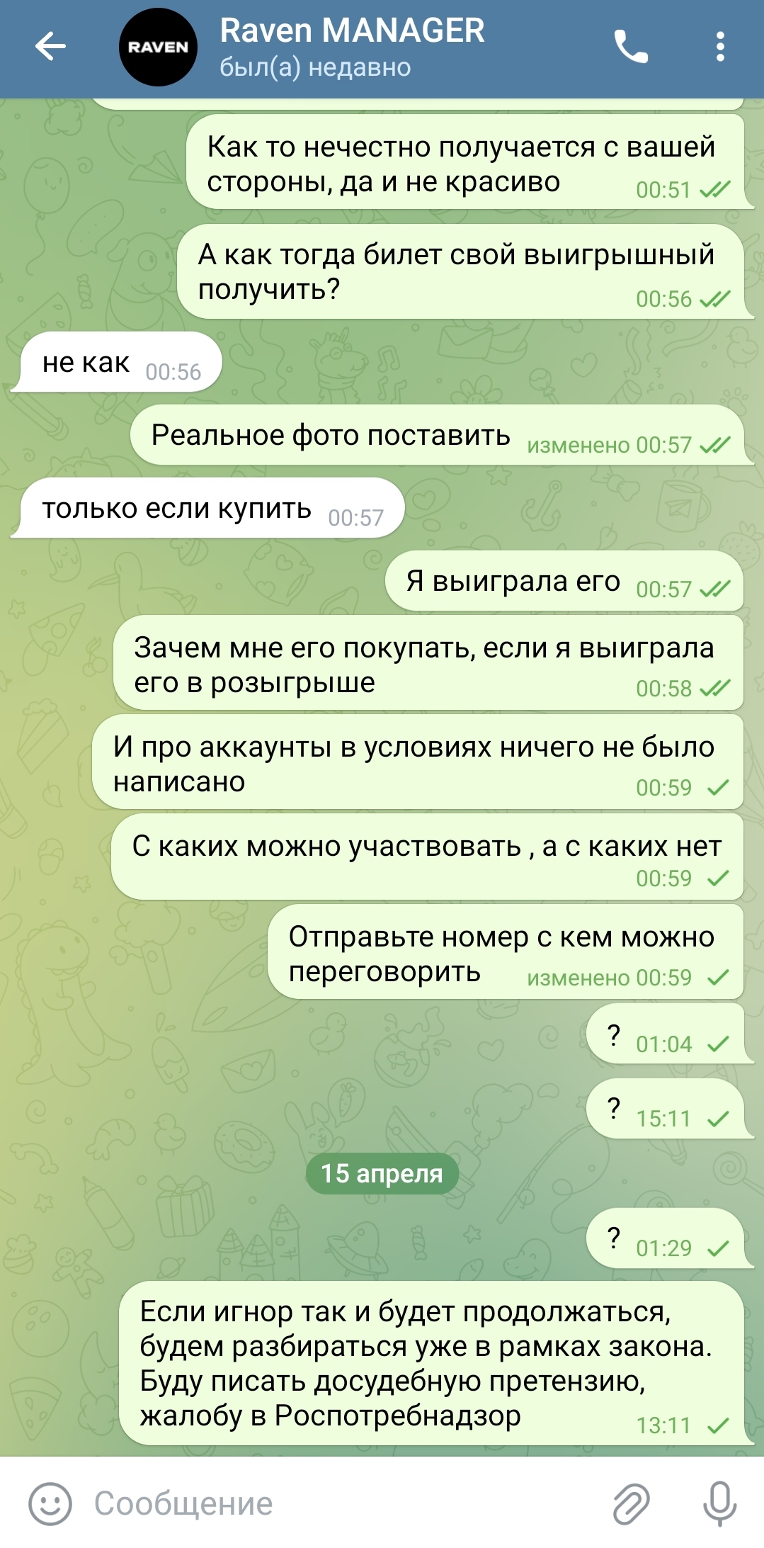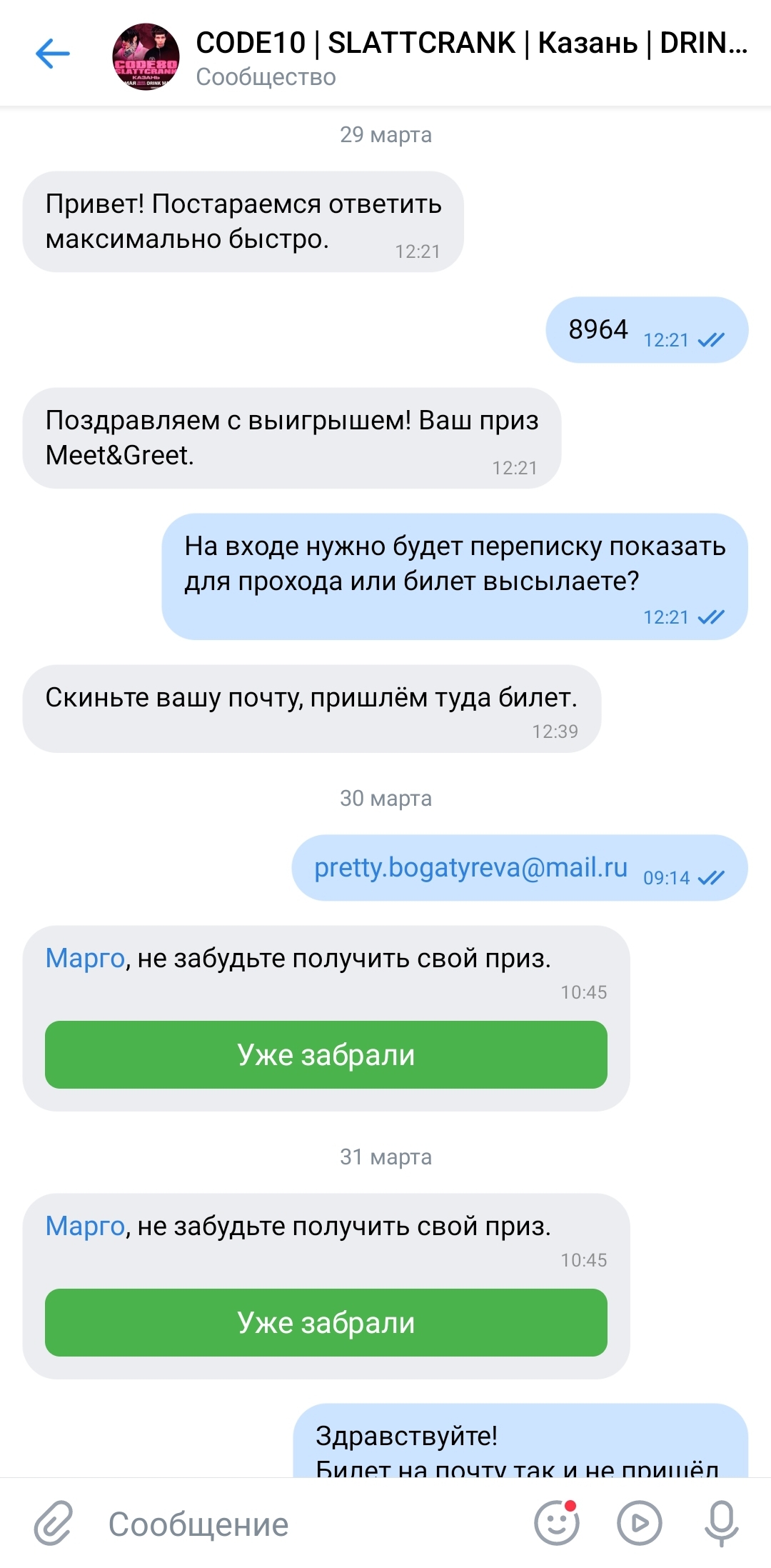 Организатор не соблюдает условия розыгрыша, билет мне высылать не хотят (стоимость 3999 руб.).