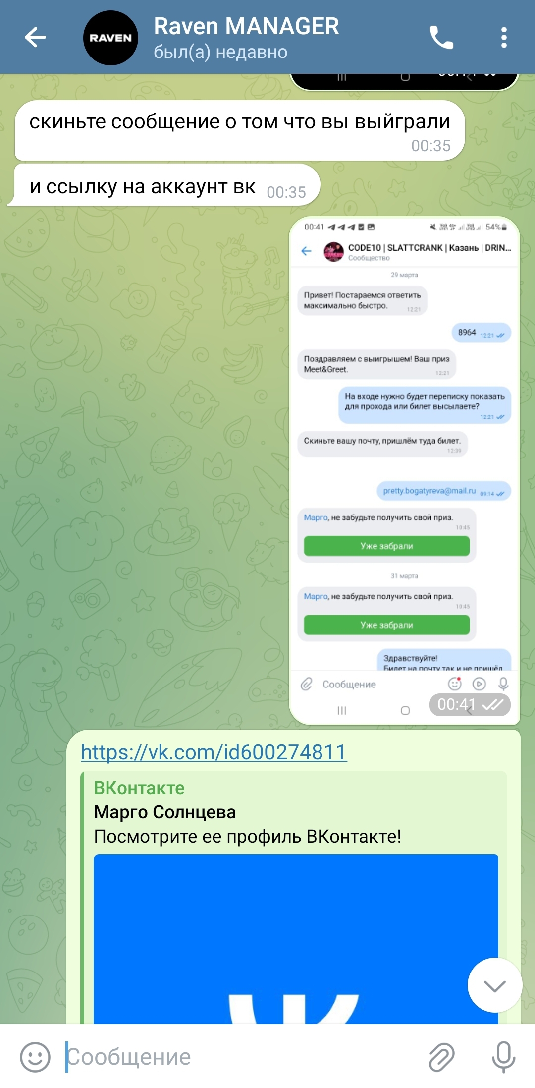 Позже пост с розыгрышем удалили, осталась только переписка с сообществом группы в контакте.