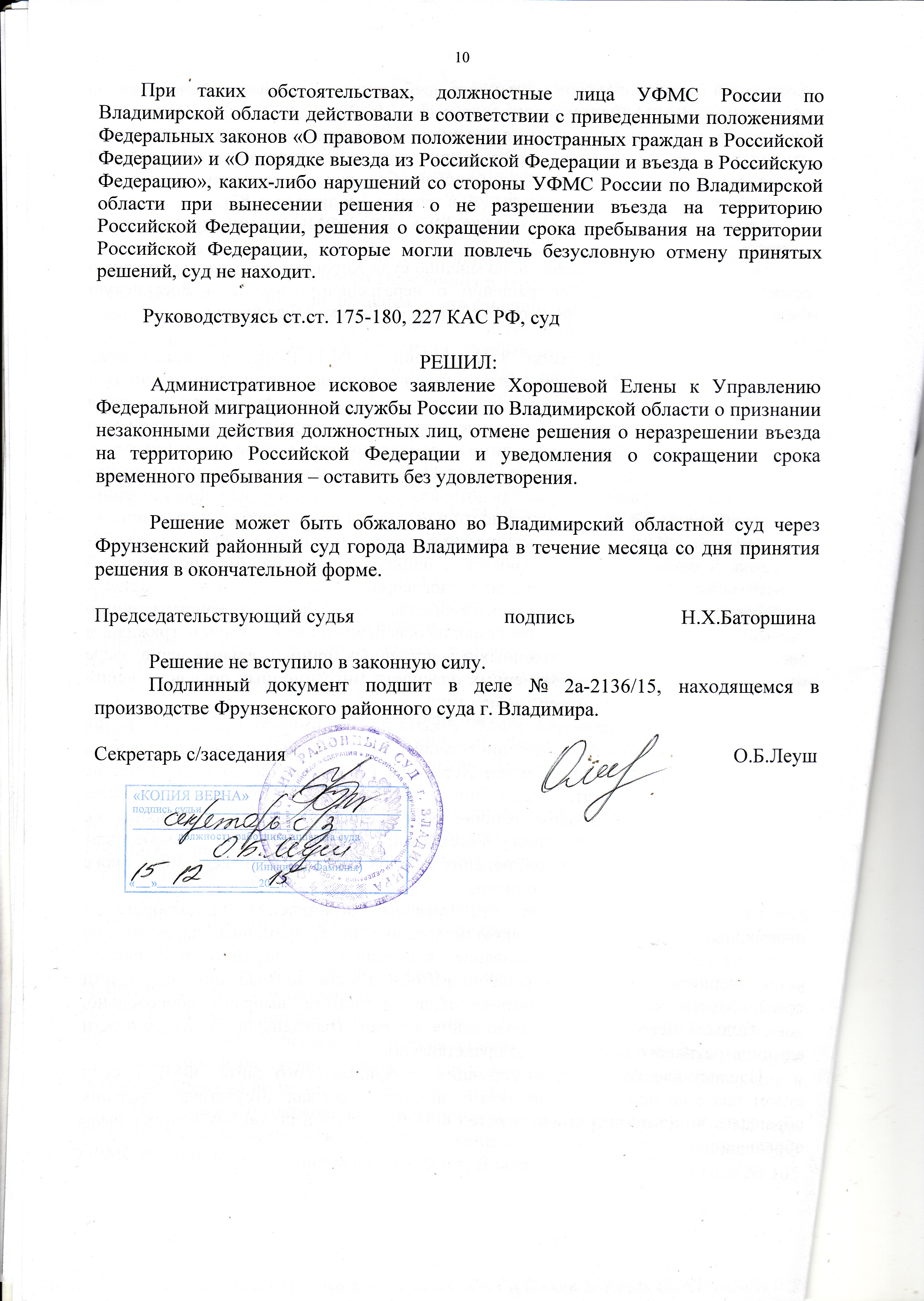 Обжалование решения УФМС по Владимирской о запрете на въезд на 5 лет. Суд Фрунзенский отказал в удовлетворении - не было адвоката, я сам не справился. до 15 января надо обжалование подать через Фрунзенский районный в вышестоящий. На данный момент нужно по решению, сам иск предоставлю при встрече как и любые другие документы, составить из того что уже сам накидал по процессуальным нарушениям, плюс озвучу свои мысли и предоставленным документам, составить обжалование. Потом представлять меня в суде. Необходимо так же предварительный Ваш прогноз по тому, что скинул.